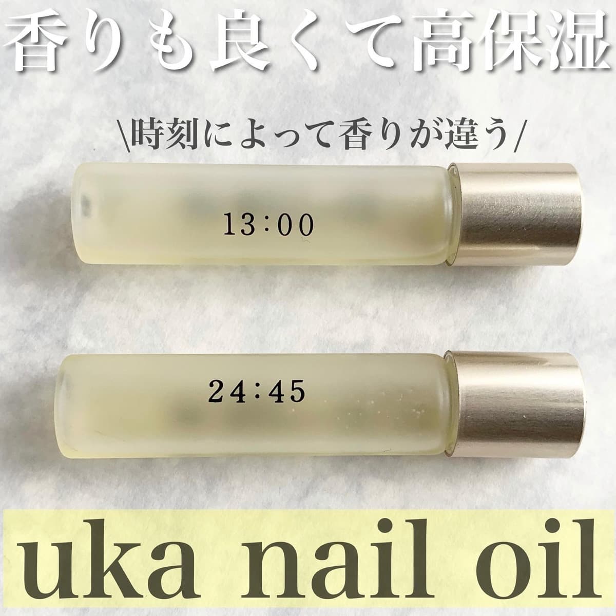 こんにちは、ますです😊 今回は香りも良くて爪をしっかり保湿してくれる ネイルオイルをご紹介します‼︎ ◯ukanail oil 13:00 ◯uka nail oil 24:45 こちらは以前友人からプレゼントしていただいたものですが 香りがとても良くてすっごい癒されます☺️ 香りも良いのに アルガンオイル、スイートアーモンド、ウィートジャム などの保湿成分もしっかり配合されているので高保湿✨ しかも、こちらのネイルオイル 表記されてる時刻によって香りが違うんです😳 13:00 ミントやレモン、パインなどの爽やかな香りに、 リッツァクベバとマージョラムの香りのスパイスが。 リフレッシュしたいときにもおすすめ! 24:45 ラベンダーにバニラ調の香りとオレンジの香りが甘くやわらかい優雅な印象を。くつろぎの時間のおともにもおすすめ! 私もともと爪の形が綺麗ではなかったんですが、 こちらのネイルオイルを使ってから気づいたら 綺麗な縦長の爪になっていました♪ 爪の保湿って大事なんですね笑 パッケージもおしゃれで成分も良いので 友人へのプレゼントにとってもおすすめです🎁 気になった方はぜひ参考にしてみてください💗