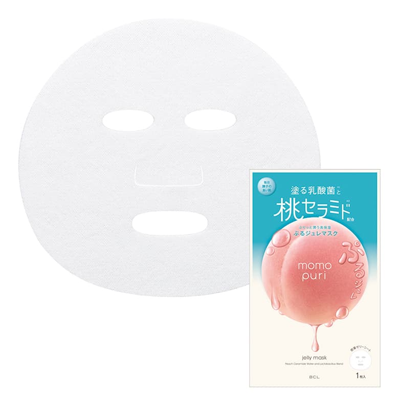 1枚でぷるっと弾む肌。塗る乳酸菌と桃セラミド配合。潤う高保湿ぷるジュレマスク。たっぷり潤う、ぷりっと弾力。ぷりぷり素肌のスキンケアシリーズ。ぷるっとジュレ感のある美容液が1枚にたっぷりひたひた含まれた、濃厚なフェイスマスク。高密着ゼリーシートがお肌に吸い付くようなつけ心地。お肌に吸い付くように密着するゼリーのようなシートマスク。目の周りまでしっかりカバーします。取り出しやすく、使いやすい1枚ずつの個包装タイプです。肌の常在菌に着目した乳酸菌「EC-12株」を配合。まるで「塗る乳酸菌*1」で弾力ある素肌へ。国産にこだわった、保湿美容液成分桃セラミド*2 を配合。たっぷり潤うスキンケア。ほんのり桃の香り。*1 乳酸菌…エンテロコッカスフェカリス*2 桃セラミド…フィトステリルグルコシド/グルコシルセラミド(以上、全て保湿)