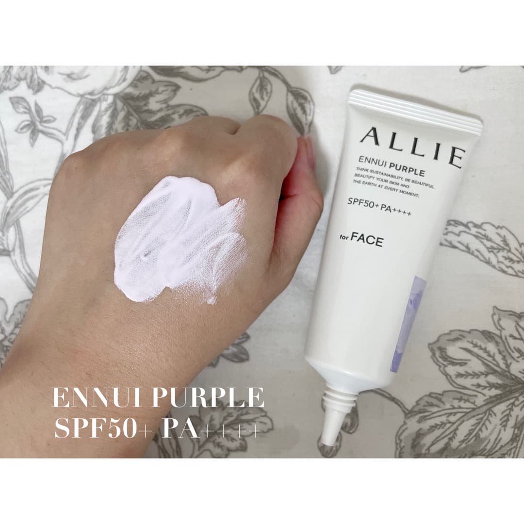 ALLIE クロノビューティカラーチューニングUV 01 ENNUI PURPLE SPF50+ PA++++ #トリルコスメティックビュッフェ でいただいたものです♡ 色むらや毛穴をカバーしてくれる色補正効果があるので、これ1つでベースメイクができちゃうくらいきれいなお肌へ。 しかも普段のクレンジングで落とすことができます◎ 普段のベースメイクは日焼け止めとパウダーで軽く済ませることが多いので、SPF値が高くお肌をきれいに見せてくれる日焼け止めは重宝します! 自然なツヤ感が残るような仕上がりで、お肌がきれいに見えるところがお気に入りです。 でも、手持ちのスキンケアとはいまいち相性が悪いのかモロモロしてしまったのが残念、、 モロモロしなければ毎日使いたいくらい使い心地は良いので、もう少し研究して使いたいな〜と思っています。 #ALLIE #アリィー #ノーファンデUV