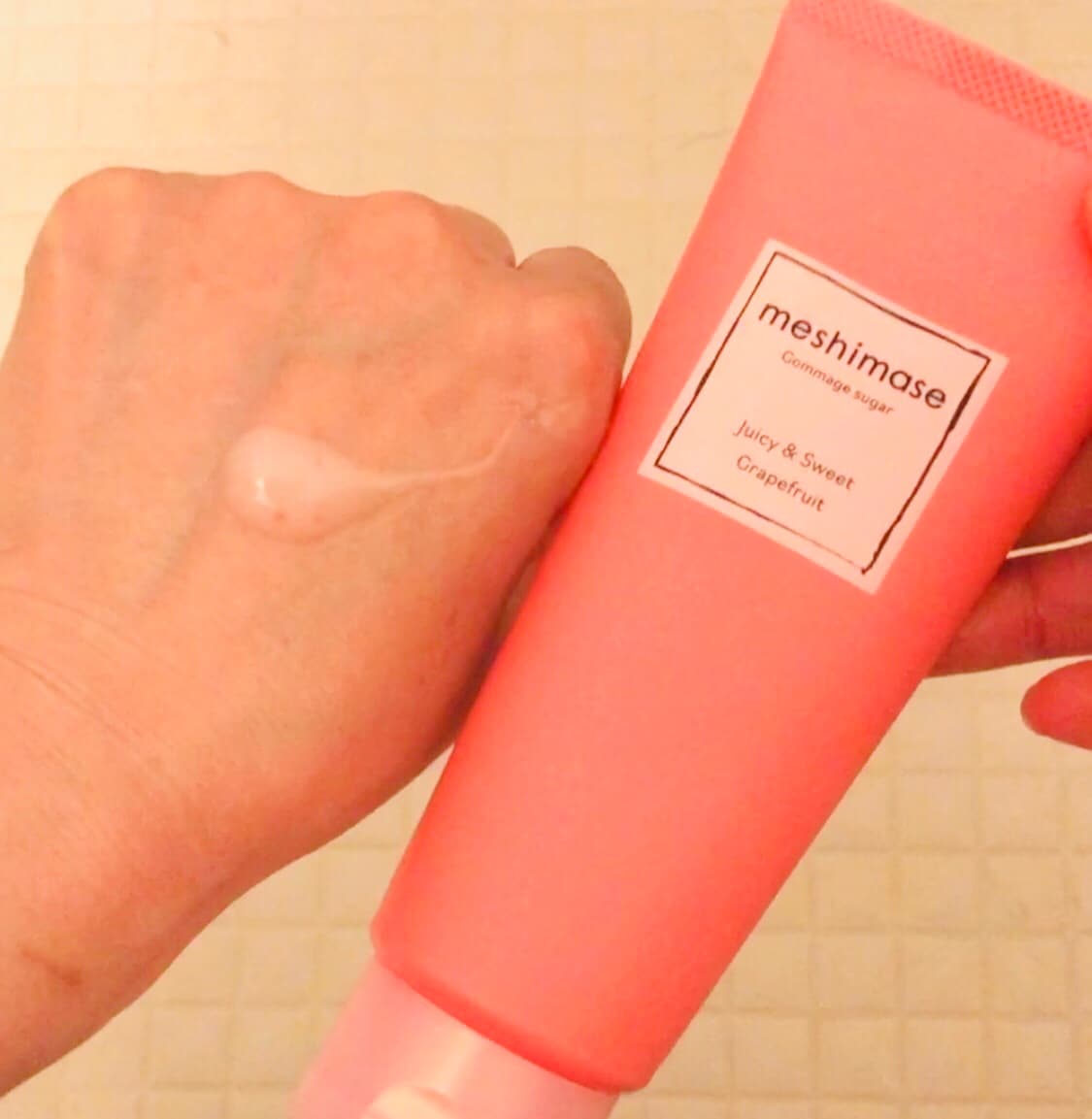 【商品の特徴】ザラつく肌に 【使用感】ザクつる 【良い点】肌に透明感 【気になる点】ややザラザラする 【おすすめの使い方】週2回ほど優しく使用 【こんな人におすすめ!】肌に透明感がない方 【総評】 ********************** meshimase ゴマージュシュガー ざく・じゅわ・ポロポロとテクスチャーが変化するボディ用スクラブinゴマージュの紹介です パッケージの見た目もピンクで可愛らしいです、ざくざくっとしたしたシュガー*スクラブ in ジェル(スクロース〔スクラブ成分〕)が肌に馴染ませるとザクトロな感覚、マッサージするとポロポロが古い角質が出てきて楽しいです、香りも爽やかで、洗い流しも簡単、みずみずしい使用感に満足です 二の腕、デコルテ、バスト、太もも、お尻などに使用させて頂きました、つるんとした手触りがうれしいですね、週2回ほど目安にお手入れしていきたいです * … * … * … * …* … *