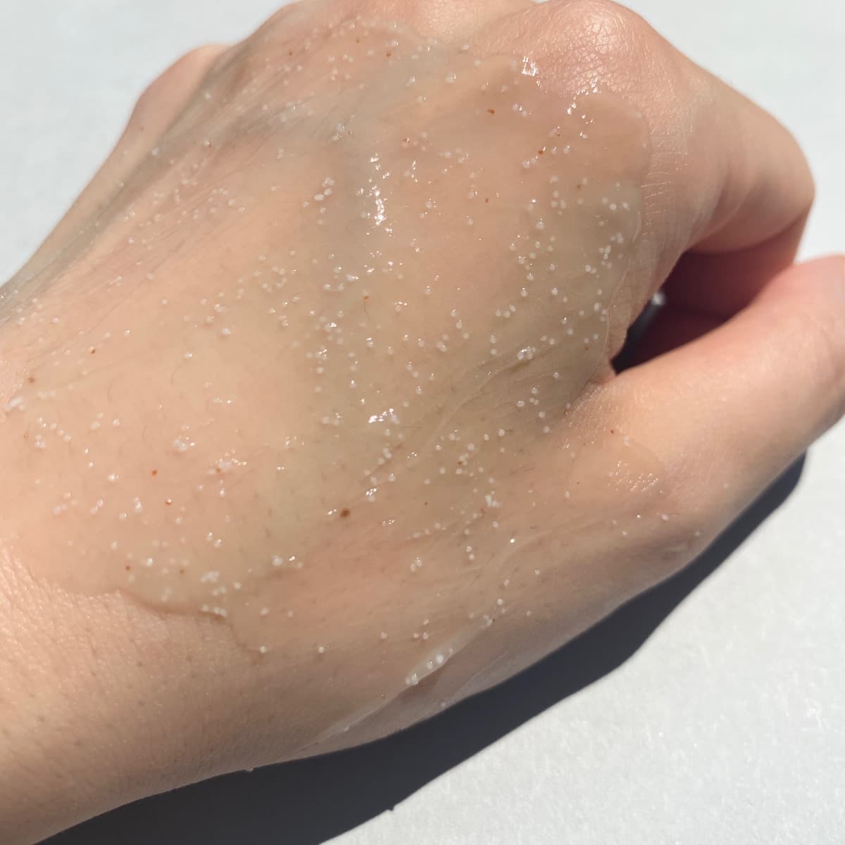 もちもちしたお餅みたいなスクラブです。 ゴリゴリした粒感はあまりなくて、パック感覚で使えます。 使ったあとは、足がスースーしてとっても気持ち良いです! 夏場にピッタリです。お風呂上がりが楽しくなります♪ 毎日使いたいくらいですが、週1〜2回の推奨なのでたまのスペシャルケアとして使用しています。 調子に乗って上半身に使ったらスースーしすぎました…全身に制汗剤かけられ続けてる感覚です笑。 キウイハーブの香りと書いてありますが、良くある制汗剤のような、甘いミントみたいな匂いでした。 オイルではなくジェルなのでお風呂掃除が楽なのも地味に嬉しいポイントです…笑