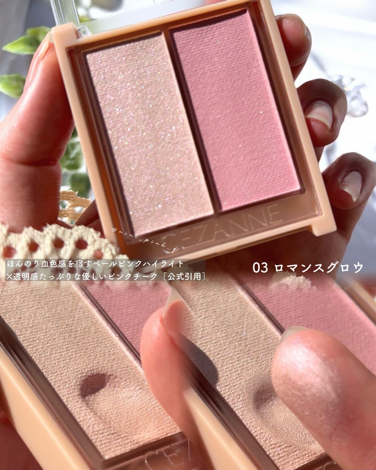 楽しみにしていたCEZANNEの フェイスグロウカラーnew color 生ぷにっ質感が伸ばすとサラっと密着! 濡れたようなうるみ艶を演出するフェイスグロウカラーに透明感&血色感ローズが登場! ハイライトやチーク、アイシャドウまでマルチに使える。10種類の美容保湿成分配合。 ✔︎02 ローズグロウ ・血色カラー(頬、まぶた) 黄みと青みのバランスにこだわったローズ。可愛さと大人っぽさどちらも秘めたほの甘な血色カラー ・ハイライトカラー(Cゾーン、鼻筋) 透明感をプラスするシフォンピンク 涙袋に使えばうるっとした目元に 両方ともフラッシュたくと分かりやすいですが かなーりパール感が強い!しっとりしている質感。 オイル入りですがベタつきはなく、パウダーでは出せない感じがイイ! 右側の血色カラーは私の頬にのせるとちょっとオレンジ感でるカラー。思ったよりも青みは控えめでした。 ニュートラルで似合う人多そう。 もちろん一色ずつ使ってもOKですが 混ぜても良さそう。 肌馴染みもよくバズりアイテムに納得です。 ご覧頂きありがとうございました