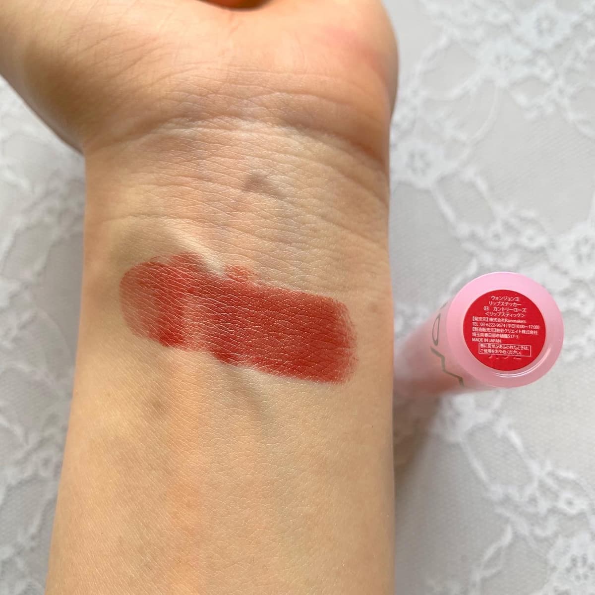 ウォンジョンヨ リップステッカーは、とろけてフィット、色持ちが続く高発色ステッカーリップです! フィックスオイルが唇の水分でゲル化し、カラーを閉じ込めて唇の表面に密着してくれるステッカーラスティング処方とのこと☝️ 今回は03 カントリーローズを使用してみました💄 腕にスウォッチを取ると深めのレッドっぽい色に発色するのですが、私の唇にポンポンっとのせるとピンク味のあるレッドに発色しました! 1度塗りでも高発色で、ベタ塗りとポンポンと塗るのとで違う発色の仕方をするのがよくわかるリップなので楽しみ方が色々あるリップだなと思います☺️ 塗布した時の感触はマットリップめな感じで、仕上がりはセミマットな感じです 唇の乾燥が気になる方は保湿してから使用した方がよさそうです🤔 コップにリップがつきにくいのが嬉しいですね🥰