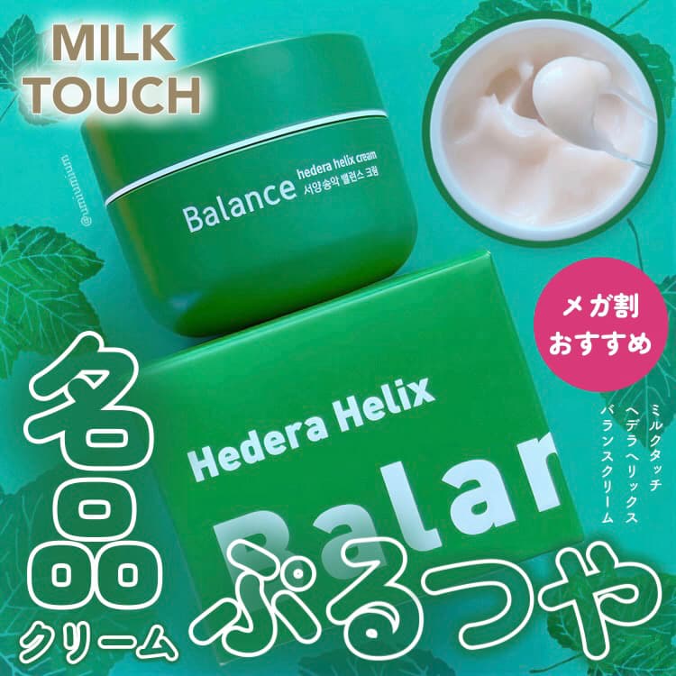 \赤ちゃんでも使える👶/ 【ぷるっぷる鎮静水分爆弾クリーム】 今回ご紹介するのは韓国大人気イ ンフルエンサーのヨンギちゃんプ ロデュースの健やかな肌へ導く 鎮静水分爆弾クリーム🌿 ••┈┈••✼••┈┈••✼••┈┈••✼••┈┈••✼ Milk Touch へデラヘリックスバランスクリーム ・価格 3,828円 ••┈┈••✼••┈┈••✼••┈┈••✼••┈┈••✼ ◆商品特長◆ 肌にたっぷり水分と鎮静を与えなが ら荒れた肌を落ち着かせて健やかな 肌へ導く保湿クリーム。 韓国特許取得成分"ヘデラヘリックス"は 暑さや寒さに強く水がなくても生き ていけるほどの生命力のある植物で ☑️鎮静効果 ☑️肌を保護 ☑️水分補給 ☑️栄養補給 の4つの効果があるそうです。 この希少性からヘデラヘリックスを 使っているスキンケアはミルクタッ チだけなんだとか! また分子量が異なる3重のヒアルロン酸 配合で肌の内外両方から水分膜で肌 を守ってくれます🍀 ◆使用感◆ ジェルとクリームの間のようなプルっ プルなテクスチャーで肌にのせると ひんやり☺️ 冷蔵庫に入れて日焼けした肌に塗るの もオススメ!! 3重のヒアルロン酸が入っているだけ あって、表面だけじゃなく肌の奥まで しっかり水分補給してくれている感じ がしました。 保湿力は特別高いという訳ではなくて 超乾燥肌の人には少し物足りないかも。 どちらかというと春夏向けのクリーム。 またこのクリームは皮脂刺激指数が 0.00なので赤ちゃんやアトピー肌の 人でも使いやすい! 実際肌荒れしてる肌や日焼けした後 に使っても全くしみませんでした😳😳 クリームのベタつきが苦手で今まで 避けていましたがミルクタッチのク リームは全然ベタつかない!! 肌の赤みも抑えてくれるので、朝の メイク前にもぴったりです🙏 ミルクタッチ公式サイトでは6/23日 限定で¥3,828 →¥2,500とお安く購 入出来るのでぜひチェックしてみて ください🎵