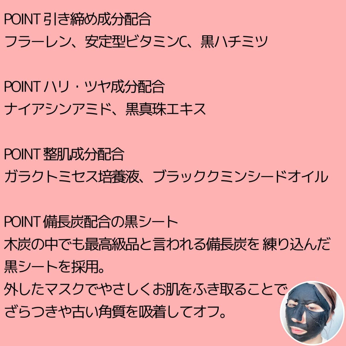 保湿力はばっちり◎ 補水効果をしっかりと感じつつ、ベタつかない! 毛穴はキュッとした感じがありました! 真っ黒のシートは柔らかくぴったりフィット。ずれてこないよ! ティーツリーの香りはスッキリ感があります。