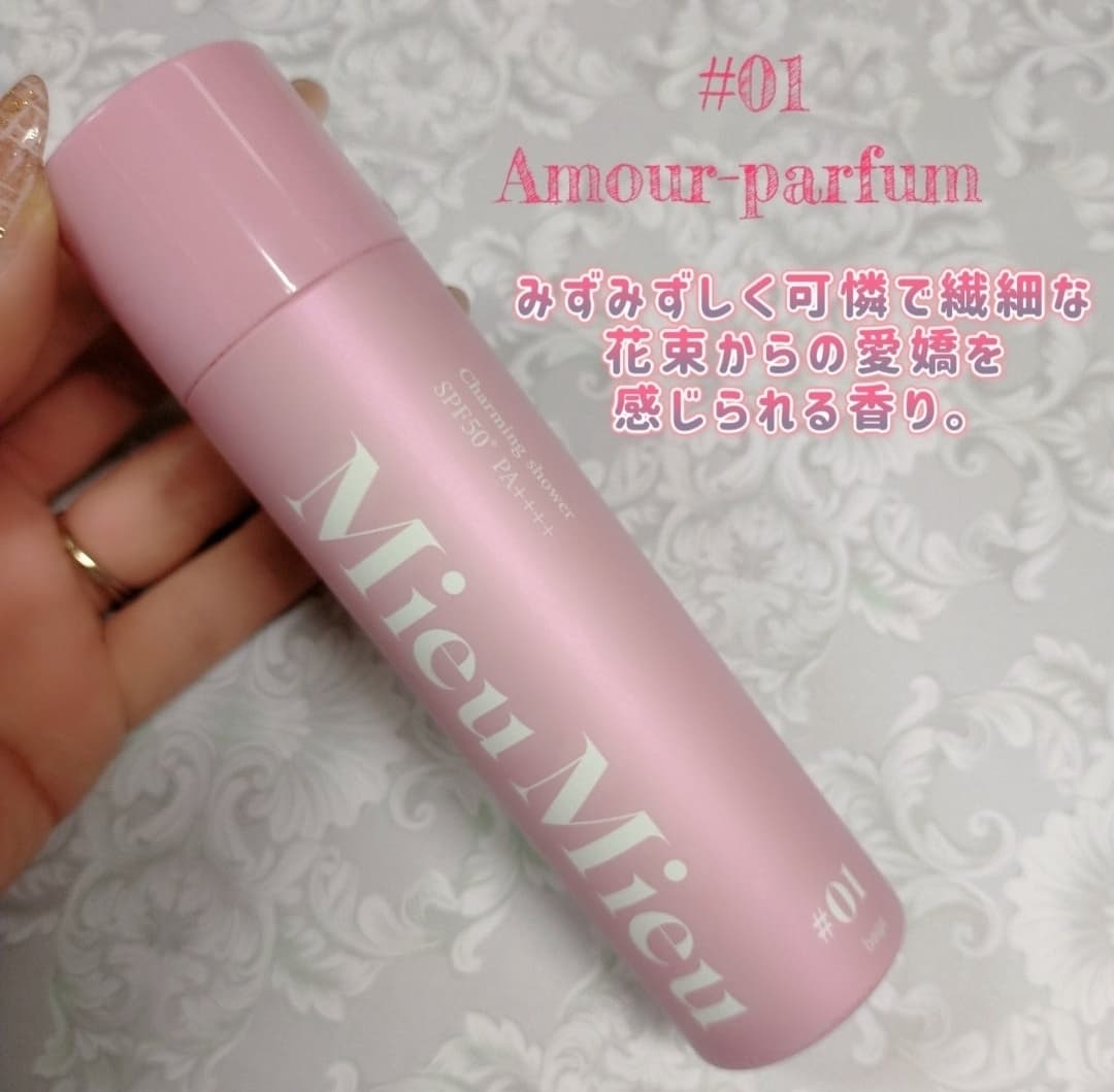 髪の毛もUVケアする時代💇♀️ お好みの香りを纏いながら さらさらと柔らかな印象の艶髪へ🫧 ---------------------------------------- ✔︎商品情報 →MieuMieu ミュミュ チャーミングシャワー 01*Amourアムール ✔︎使ってみた感想 →香りの種類が豊富で私が選んだのはフローラルベースの華やかな香りのAmour💐 ピンク色の可愛らしいパッケージと小柄なボトルなので持ち運びやすいし、SPF50+ PA++++なのがとても嬉しい✨ 結構スプレーが勢いよく出るので距離はしっかり取ってからかけてあげると全体を満遍なくケアできるかなとおもいます! ---------------------------------------- #ミュミュ #雰囲気盛れ香水 #チャーミングシャワー #UVスプレー