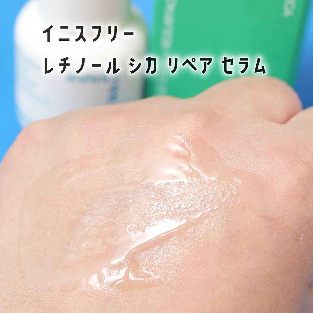 SNSでよく見かける イニスフリーの大人気の美容液 レチノールシカリペアセラムをご紹介✨ ころんと可愛いフォルムの パッケージにリニューアルされました🙌💕 (容器のみの変更で容量・価格および成分等は 変更前のものと変わり無いそうです!) レチノール(整肌成分)&シカ成分*1配合で 肌トラブル*2を防いでつるんとなめらかな ピュア肌に導いてくれる美容液です♡ *1 アシアチコシド、マデカシン酸、アシアチン酸(全て整肌成分) *2 乾燥による肌荒れ 肌への負担に配慮した低刺激性処方*3で デイリー使いしやすいのも嬉しい✨ 初めてレチノールアイテムをご使用される方も 取り入れやすいのも◎ *3低刺激テスト済み/自社調べ テクスチャーはみずみずしく 少しとろみがあるタイプでよく伸びます。 馴染ませやすくてべたつきにくく さっと使えるのも良かったです! 使うタイミングは乳液を塗った後! 美容液を塗ったらクリームで重ねて しっかり保湿してあげるのが良いそうです☝️ 使うタイミングは夜のスキンケア時に! (レチノールは紫外線の影響を受けやすいそう🧐) こちらはNOIN様マジレポ企画にていただきました♡ 素敵なお品物をありがとうございました✨ 気になっている方のご参考に 少しでもなりますと幸いです!