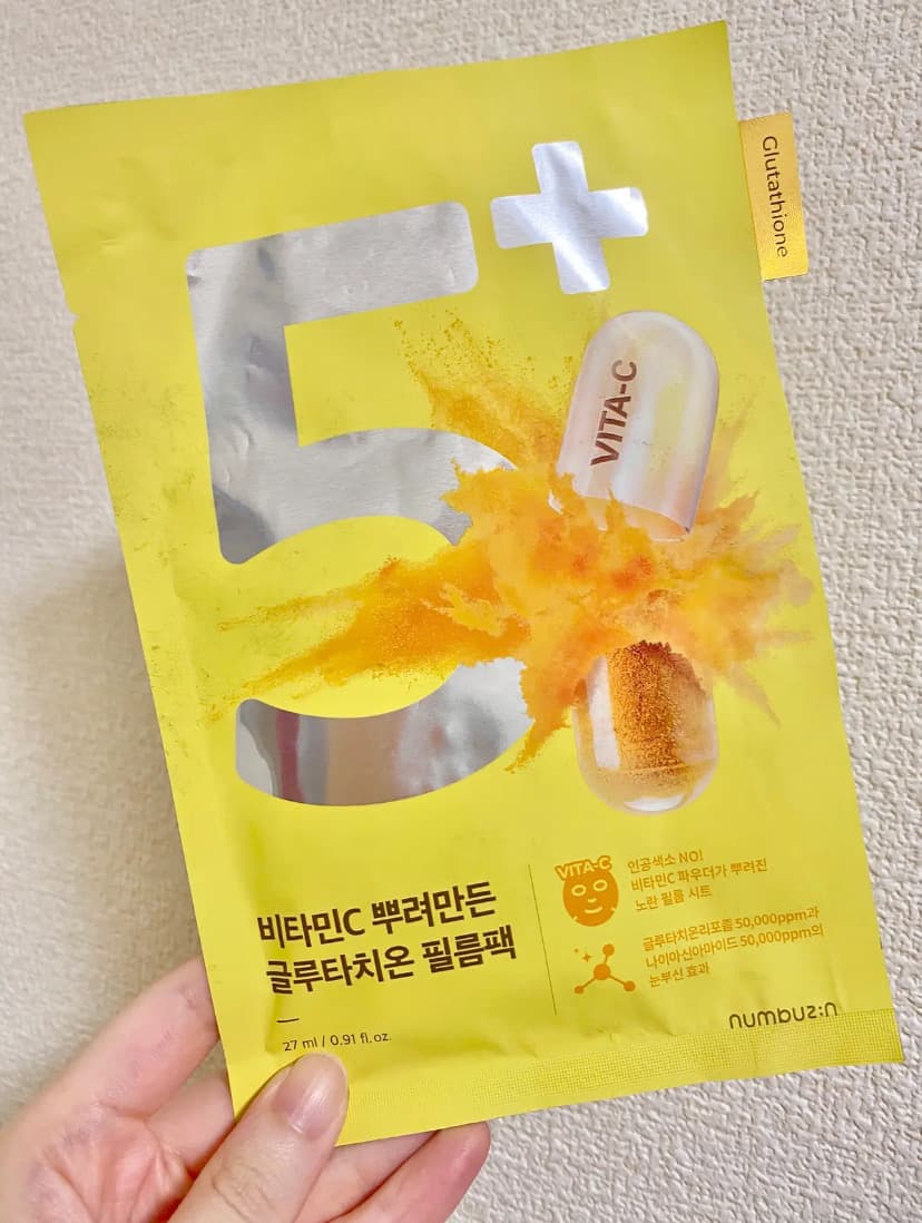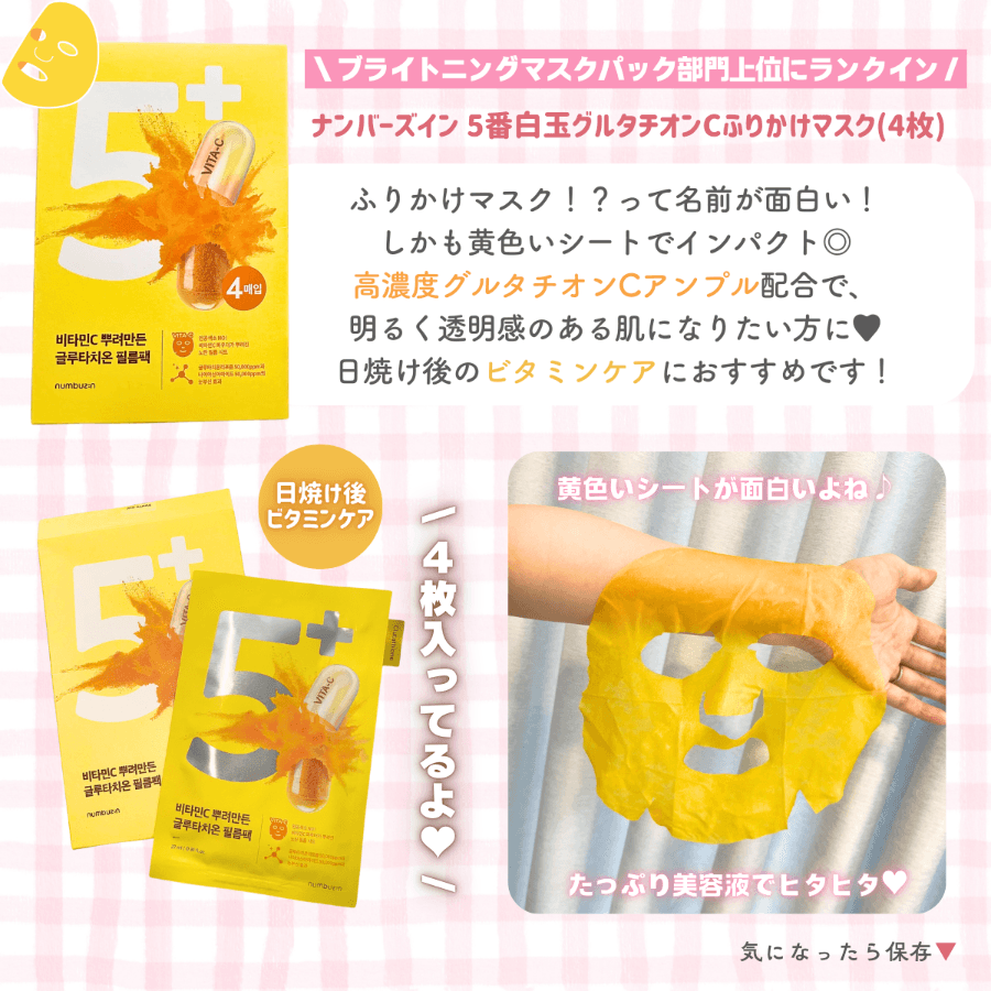 \ 日焼け後ビタミンケア🍋 / ❏ 𝗻𝘂𝗺𝗯𝘂𝘇𝗶𝗻 #5番白玉グルタチオンCふりかけマスク 黄色いシートにびっくりするはず!?😂 日焼け後のビタミンケアにぴったりのマスクです💛 冷やして使っても気持ち良い❄️ もちろん即効性などはありませんが、夏にダメージを受けた お肌にスペシャルなケアとして使用したいシートマスク🌞 SNS映えするインパクトのある黄色いシートが特徴です。 商品はスタイルコリアン様よりご提供いただきました。
