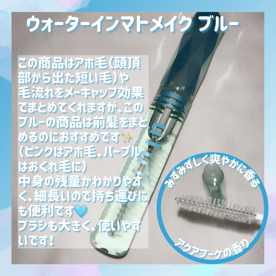 ウルリスさまから商品提供いただきました🫧‪ ♡⃛ ululis ウォーターインマトメイク ブルー Natural & Blue このブルーの商品はマトメイクシリーズの中では前髪をまとめる* のに適しています✨️ 少しツヤ感も出るタイプなので、適度なスタイリング感も出て、良かったです✨️ 香りもすっきりした甘い顔りで、きつくなくつけていてもほんのり香るくらいでした🩵 液の残量が見やすいパッケージになっているのもとても良かったです✨️ ブラシが大きくて使いやすかったので、他のシリーズも使ってみたくなりました😊🩷💜 *メーキャップ効果による